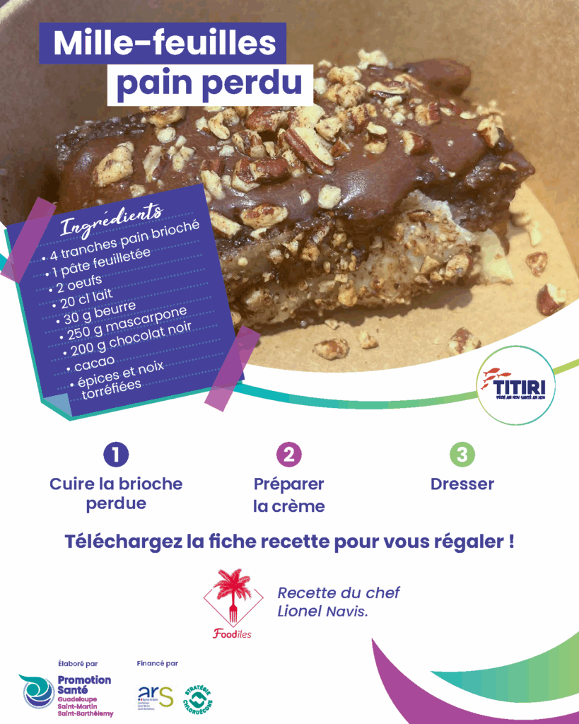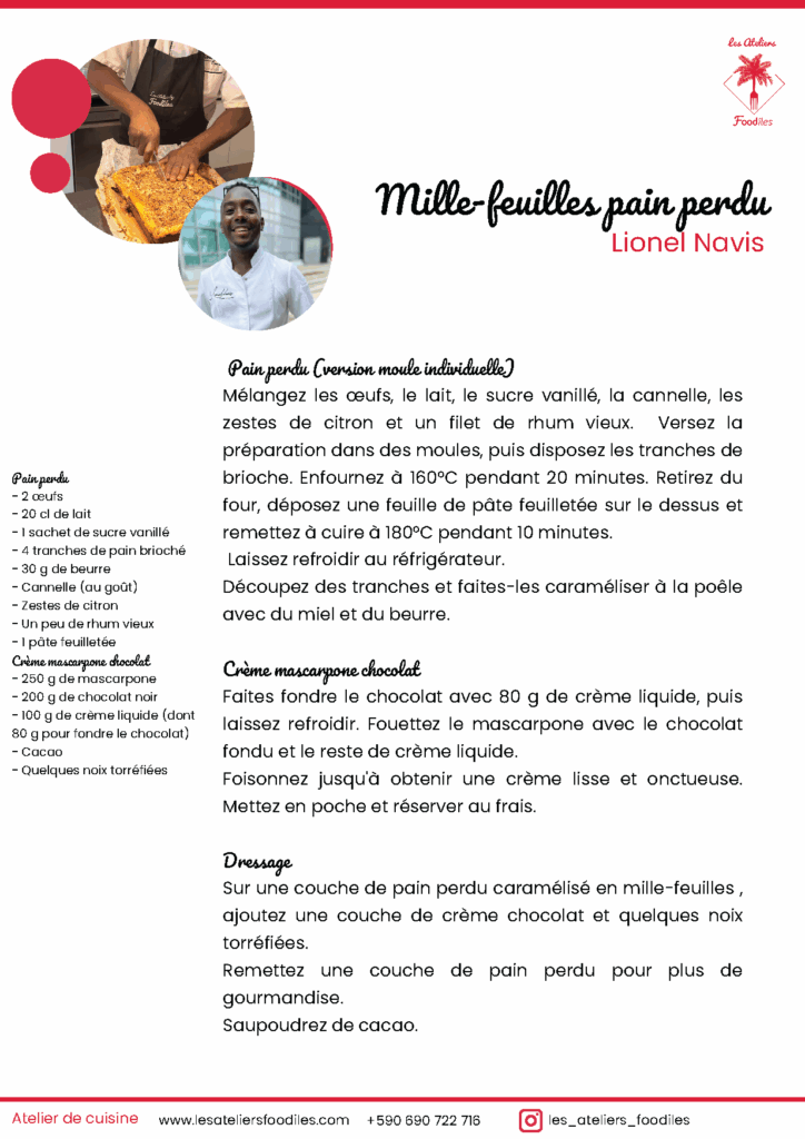 Sur une couche de pain perdu caramélisé en mille-feuilles, ajoutez une couche de crème chocolat et quelques noix torréfiées.